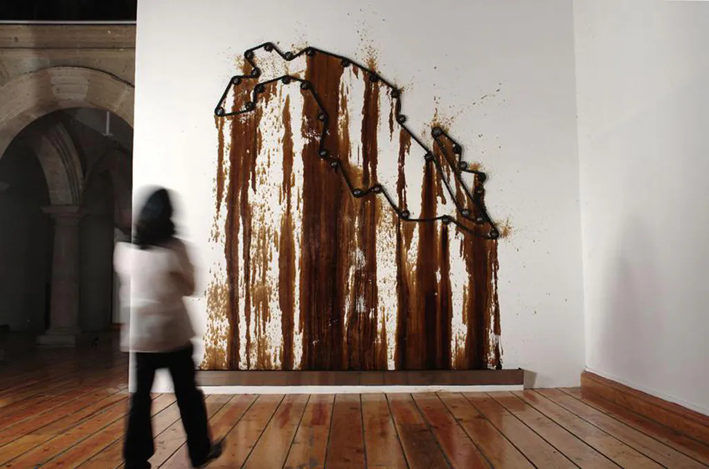 La obra consiste en una bomba de maquinaria industrial instalada para hacer circular aceite quemado de automóvil, que a través de un catétersobre el muro fue dibujando el contorno de una ciudad.