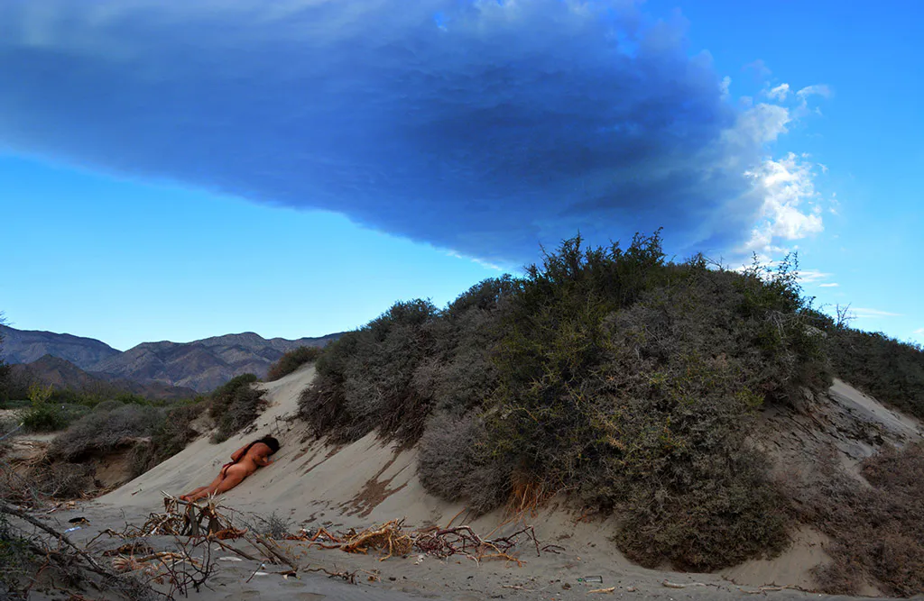 Rachel Carson2, menciona en su libro El mar que nos rodea: “Llevamos en las venas la corriente salina de nuestra sangre, en las que el sodio, el potasio y el calcio se hallan en combinaciones semejantes a las que existen en el mar… Esta es la herencia desde el día, hace un número incalculable de millones de años, en que un remoto antecesor pasó de la etapa unicelular a la multicelular y adquirió por primera vez un sistema respiratorio en el interior de cual corría un rumor casi idéntico al de los océanos.” Habitar la Península –que es casi una isla- implica cruzar el mar o atravesar el desierto; cuando me adentro en él, sé que cualquier ruta me llevará sin perderme hasta el Océano Pacífico y sus extensiones. Sin duda, el valor de hacerlo se vincula estrechamente con el “acto fotográfico” que realizo en cada viaje para poseer y reinventar otros paisajes. “Huracán de sal” fue edificado en cinco viajes que empecé en marzo del 2014 en Cataviña, La Laguna de San Ignacio, y Bahía de los Angeles. Pero durante la invención de las imágenes el ojo oscuro de Odile, entró a tierra por Los Cabos de la Península y arrastró mi casa y el desierto al a; Golfo de California.