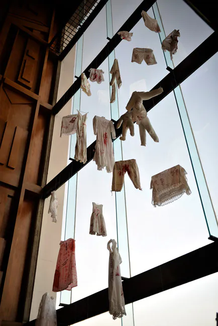 1. Mis cicatrices. 2016. Instalación de vestidos bordados. 20 x 7 x 1.20 mts.