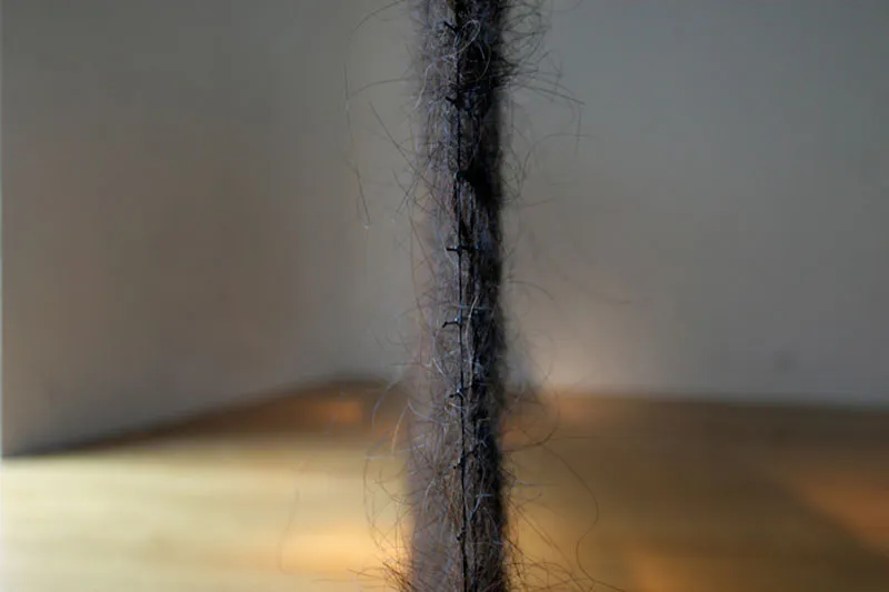Gabriela Gutiérrez se atreve así a sugerir que es en la fragilidad del material, del discurso plástico, donde encontraremos la fortaleza de encarar las nuevas preguntas. Veamos esa escultura, otra vez, una pieza de expiación: Vestido de pelo es inquietante. Vestido materno, cotidiano, vestido que se transforma en una oblación al reunir esos pelos. Si la imagen de Coatlicue, que vemos en los museos, es aterradora es porque es el arquetipo que se repite una y otra vez en las imágenes de otras Diosas. Muchas de las obras sugieren un erotismo primitivo y abrasador donde el único cobijo son estos hilados de cabellos para resistir a la intemperie.