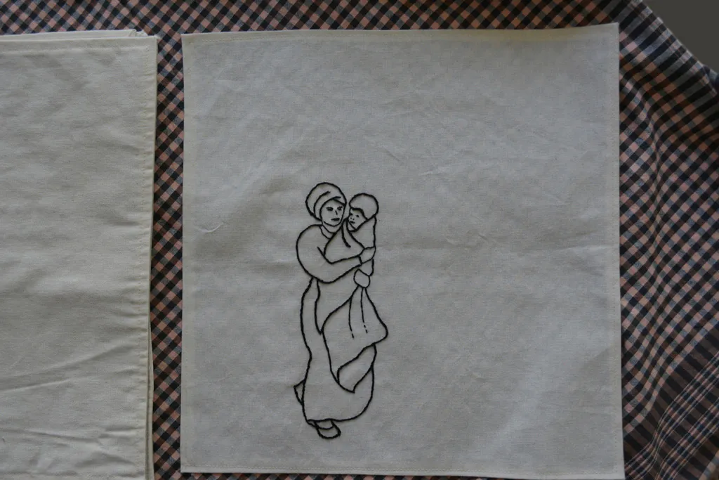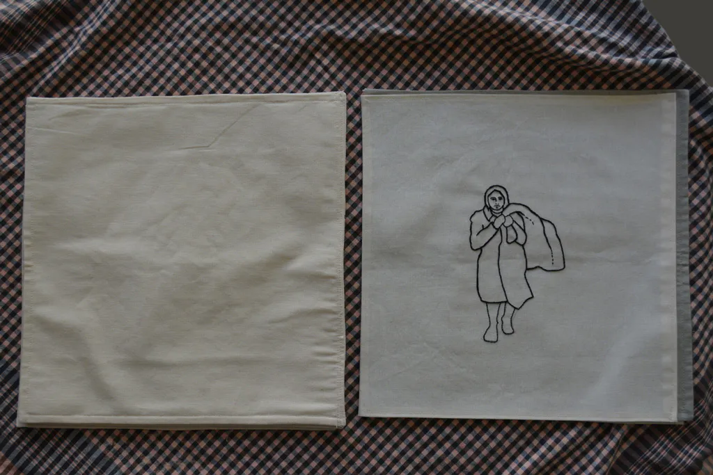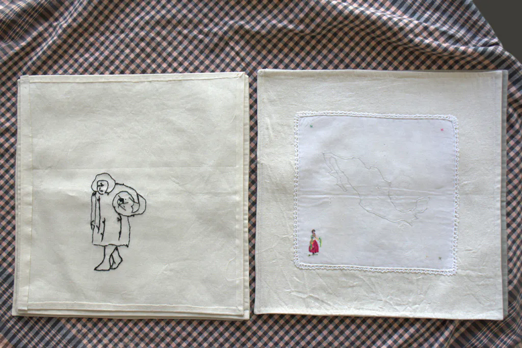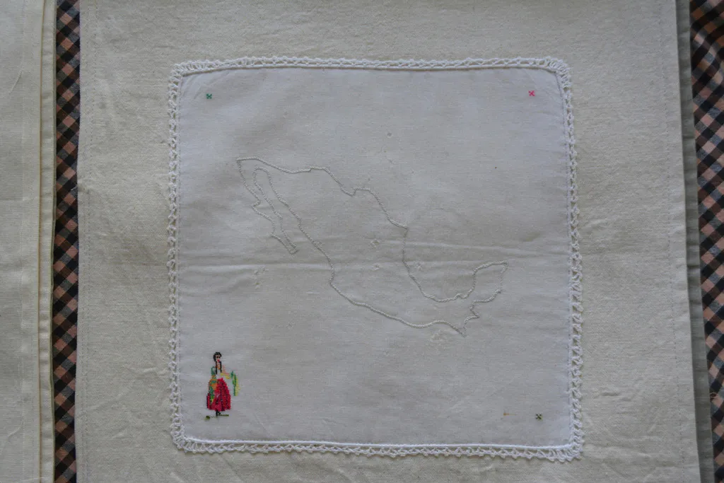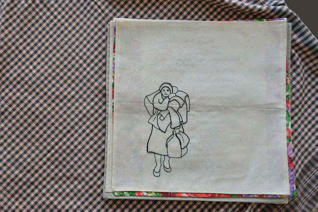 Las imágenes de las mujeres han sido bordadas a partir de dibujos inspirados en fotografías de la época, tomadas entre 1936 y 1939 en España. Estos lienzos de manta son protegidos y trasladados en un pañuelo de hacer bultos, en catalán llamado mocador de fer farcells. Este pañuelo en particular perteneció a la abuela de mi pareja, también catalana exiliada.
