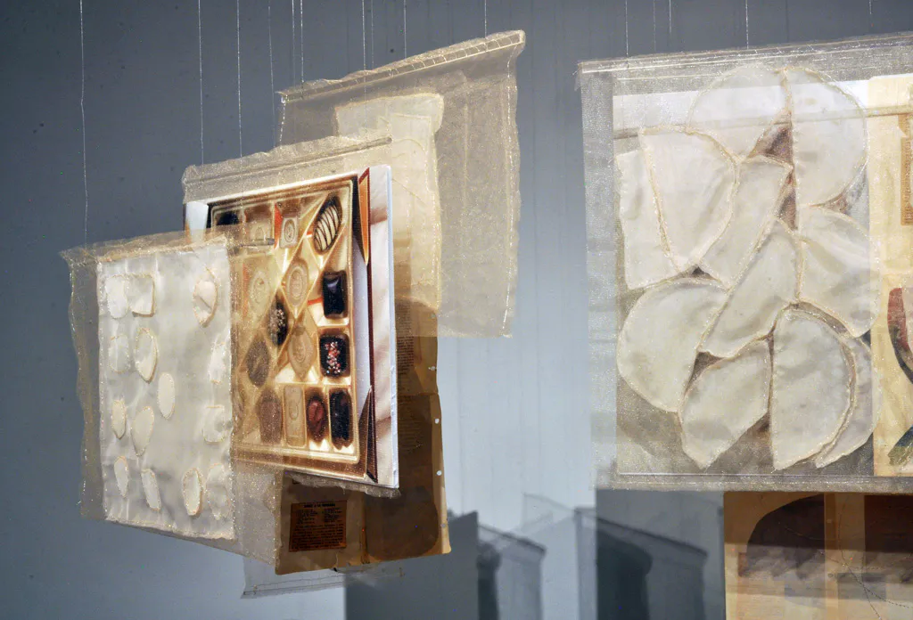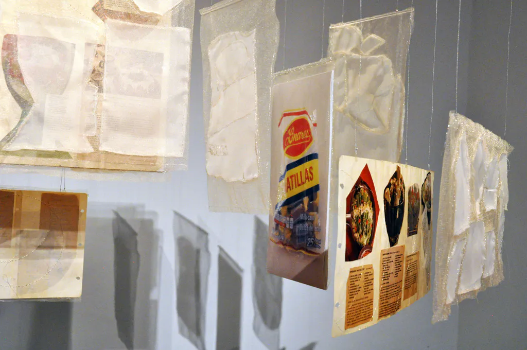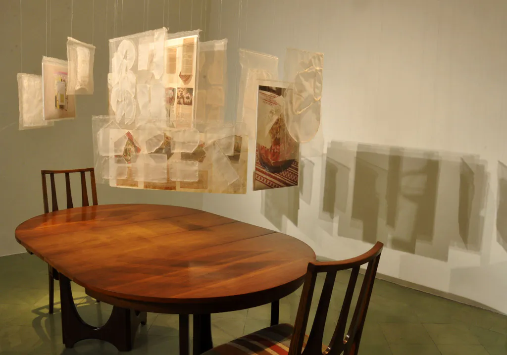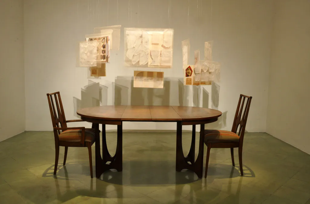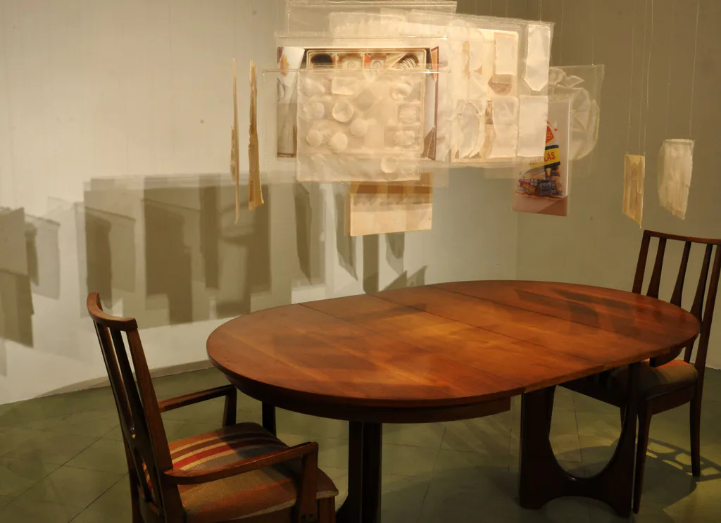 La pieza central de la muestra es la mesa de reunión familiar. Sobre ella penden imágenes de los viejos recetarios de la madre, de los platillos que cocinaba y de los regalos comestibles que amorosamente le fueron regalados en su última etapa. Estas imágenes la artista las interviene con hilo metálico y chaquiras: se imagina a si misma atesorando los recuerdos, cuando atrapa la luz que se refleja, cuando pasa tiempo con lo que hoy son materiales, pero que antes fueron una promesa de vida, de reciprocidad. Esto queda afirmado a través del mueble en forma ovalada. Imposible no remitirse al flujo del dar, que a la vez que nutre, sella los afectos y crea la memoria cotidiana, precisamente con ayuda de estos objetos y estas acciones. Proveer y habitar el círculo del don para mantenerlo vivo y no olvidar.