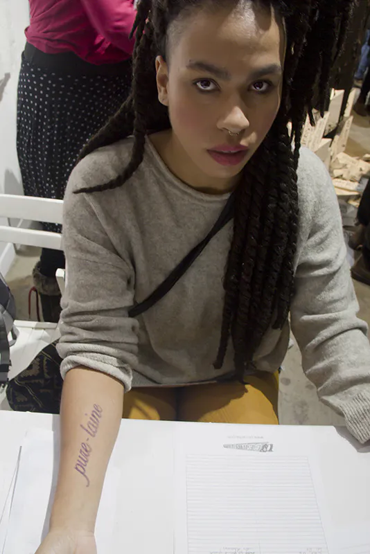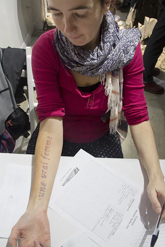 El proceso es colaborativo y la dinámica consiste en ofrecer tatuajes gratis a la gente que transita en una vía determinada o dentro de una exposición. La condición es que la artista es quien escoge el tatuaje y después de la aplicación y antes de se seque, ellxs tendrán que pensar en una frase alternativa que tenga el mismo significado que el tatuaje pero sin ser discriminatorio. A cambio de la nueva frase la artista borra el tatuaje y la anota en una lista que será compartida con quienes participaron al igual que con su lista de correos. Generando de manera colectiva herramientas para repensar el lenguaje y hacerlo más incluyente y eliminar la discriminación lingüística.